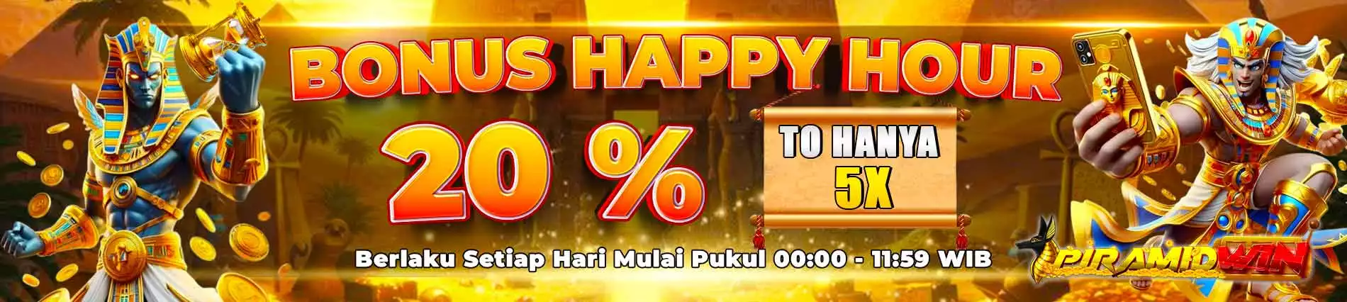 - Kode Promo bonus di depan: HAPPY HOUR SLOT 20% TO 5x.